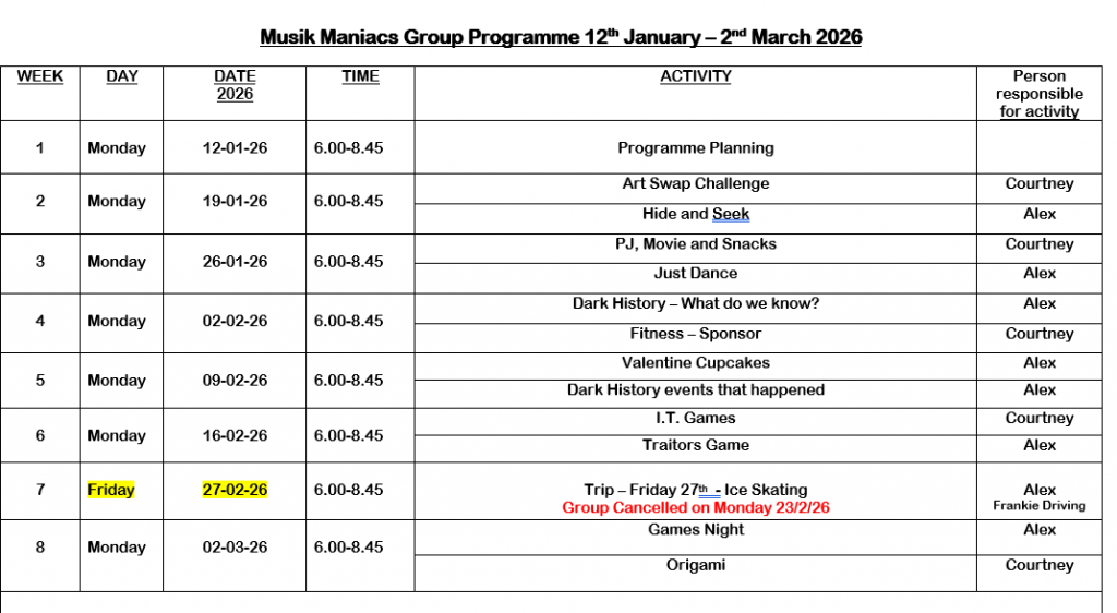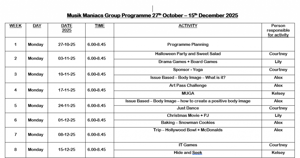 We are an all girl, second year youth group who meet in the Project on a Monday NightWe a fun loving group with high energy levels who like to do Arts and Crafts, Baking, use the Focus gym and MUGA and play lots of indoor and outdoor games which we love.